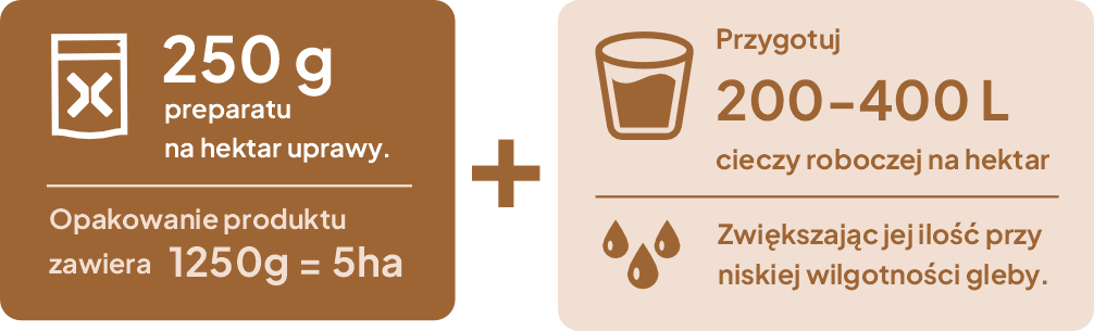 Wykonaj oprysk zalecaną dawką preparatu, dopasowaną do Twojej uprawy. Zalecany jest oprysk średnio lub grubokroplisty.
