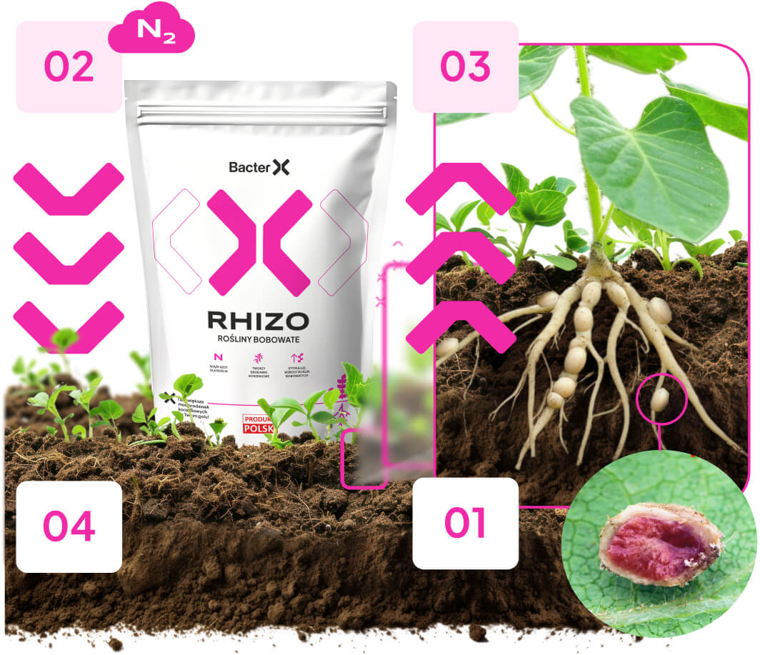 BacterX RHIZO zawiera specyficzne dla roślin bakterie brodawkowe inicjujące wiązanie wolnego azotu w roślinach. Bakterie te tworzą z roślinami bobowatymi symbiozę, która polega na wytwarzaniu brodawek korzeniowych. Ich różowe zabarwienie świadczy o intensywnym procesie wiązania azotu.