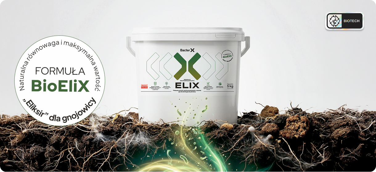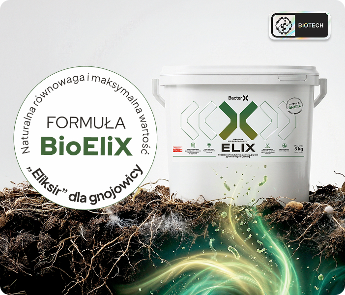 BacterX ELIX to innowacyjny preparat mikrobiologiczny przeznaczony do biologicznej obróbki gnojowicy, obornika oraz innych odpadów organicznych. Dzięki specjalnie opracowanej Formule BioEliX™, produkt aktywuje naturalne procesy fermentacyjne, przyspiesza rozkład materii organicznej i poprawia właściwości fizykochemiczne gnojowicy, czyniąc ją bardziej wartościowym i efektywnym nawozem.